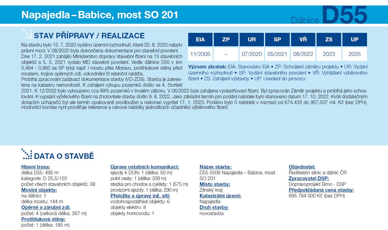 ŘSD obdrželo 5 nabídek uchazečů na realizaci stavby “D55, 5506.1 Most SO 201 a souvisejících objektů”. Nejvýhodnější nabídku podalo sdružení FIRESTA-Fišer, rekonstrukce, stavby a.s. a MI Roads a.s. za 674,433 mil. Kč bez DPH, což je cca 96,9 % předpokladu. Stavba má pravomocné stavební povolení.