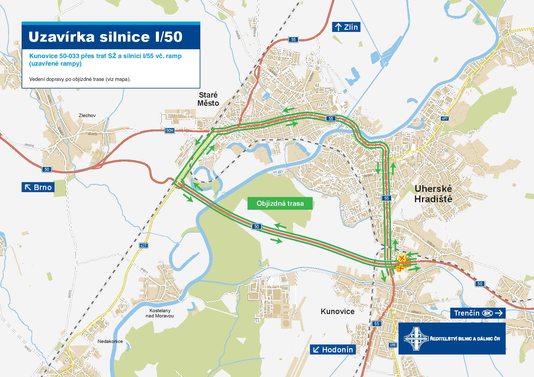 Na estakádě půjde o opravu povrchu vozovky a dilatačních závěrů. O víkendu opravený most zprovozníme a naopak uzavřeme východní nájezdové a sjezdové rampy ze silnice I/50 na silnici I/55. Oprava jejich povrchu potrvá 30 dní. Za uzavřené rampy je opět stanovena objízdná trasa viz mapka níže. Sjezdová rampa do Kunovic bude uzavřena a opravena během uzavírky estakády. Během opravy ramp bude tento sjezd již v provozu.