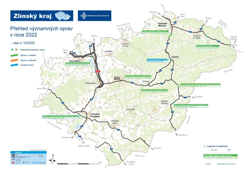 - Opravujeme most přes řeku Rusavu v Hulíně na silnici I/55. Objízdná trasa pro vozidla s konstrukční rychlostí vyšší než 80 km/h je vedena bezplatně po dálnici D1 a D55. Objízdná trasa pro vozidla s konstrukční rychlostí nižší než 80 km/h vede po silnici přes Tlumačov a Kvasice. Bez omezení bude most opět průjezdný v zimních měsících. Následně budou práce pokračovat na jaře 2023, a to po skončení topné sezóny, kdy proběhne demontáž plynovodu.