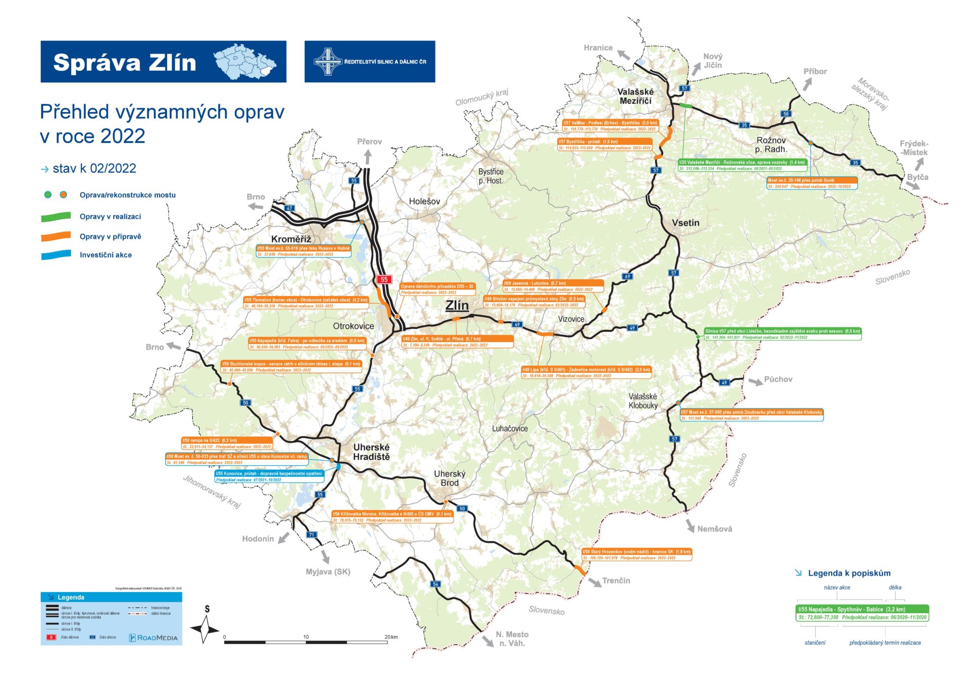 Správa Zlín ŘSD ČR chystá v roce 2022 řadu oprav na komunikacích I. třídy. Na území Zlínského kraje zatím plánujeme 20 akcí, z toho opravy 4 mostů. V realizaci už jsou 3 projekty (viz mapka níže). Dva začaly už v loňské stavební sezóně a letos je budeme dokončovat. V případě opravy komunikace I/35 ve Valašském Meziříčí v ulici Rožnovská už půjde jen o drobné dokončovací práce, jako například nástřik vodorovného dopravního značení. Vše doděláme na jaře, jakmile bude příznivější počasí. Dopravu tyto práce už výrazně neovlivní.