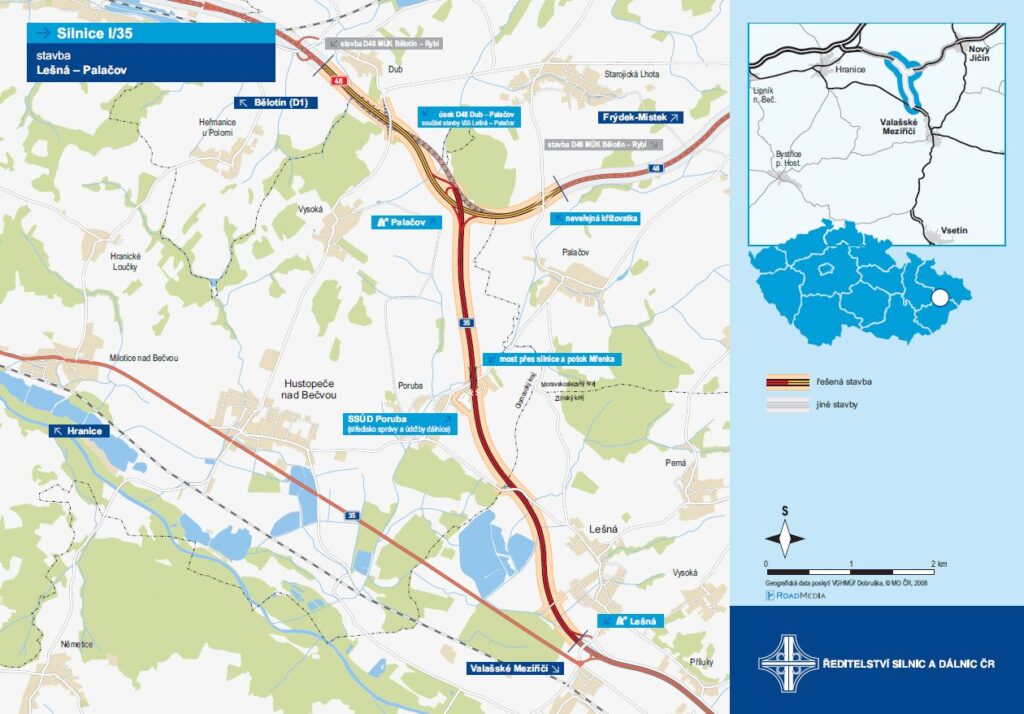 Už tento týden zahájíme přípravné práce na stavbě „I/35 Lešná – Palačov“. Půjde o skrývku ornice, kácení dřevin a záchranný archeologický průzkum. Cílem stavby je převedení dopravy z velmi vytížené trasy silnice I/35 na nově vybudovanou čtyřpruhovou komunikaci I/35 s napojením na dálnici D48 u Palačova. Takzvaná „Palačovská spojka” nejvíce uleví městu Hranice a také obcím, přes které je nyní vedena doprava po silnici I/35, tj. Hustopeče nad Bečvou, Milotice nad Bečvou, Teplice nad Bečvou. Řidiči se zde poprvé projedou v roce 2025. Aktuálně probíhá výběrové řízení na zhotovitele hlavních stavebních prací.