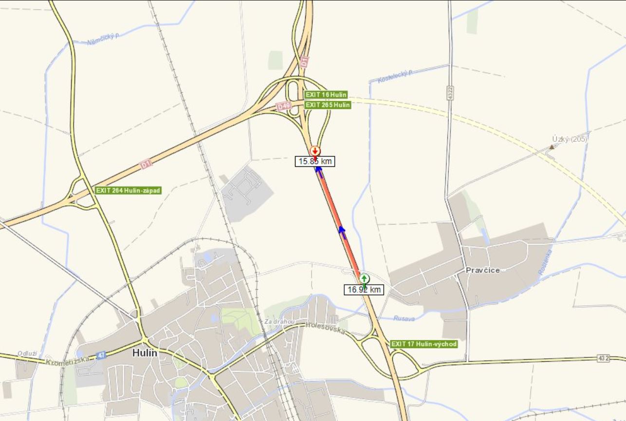 Upozorňujeme řidiče na částečné omezení provozu na dálnici D55 v km 15,8 -16,9 ve směru na Hulín (viz mapka níže), kde dnes do 18 hodin budeme opravovat cementobetonový kryt vozovky. V pracovním úseku projedete jedním jízdním pruhem. Projíždějte se zvýšenou opatrností!