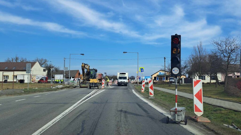 Upozorňujeme řidiče na kyvadlový provoz na silnici I/55 v Babicích. Začali jsme zde dnes opravovat povrch vozovky, který poškodila těžká stavební technika během budování nové okružní křižovatky a dálnice D55 v úseku Babice – Staré Město. Omezení skončí do 3 týdnů.