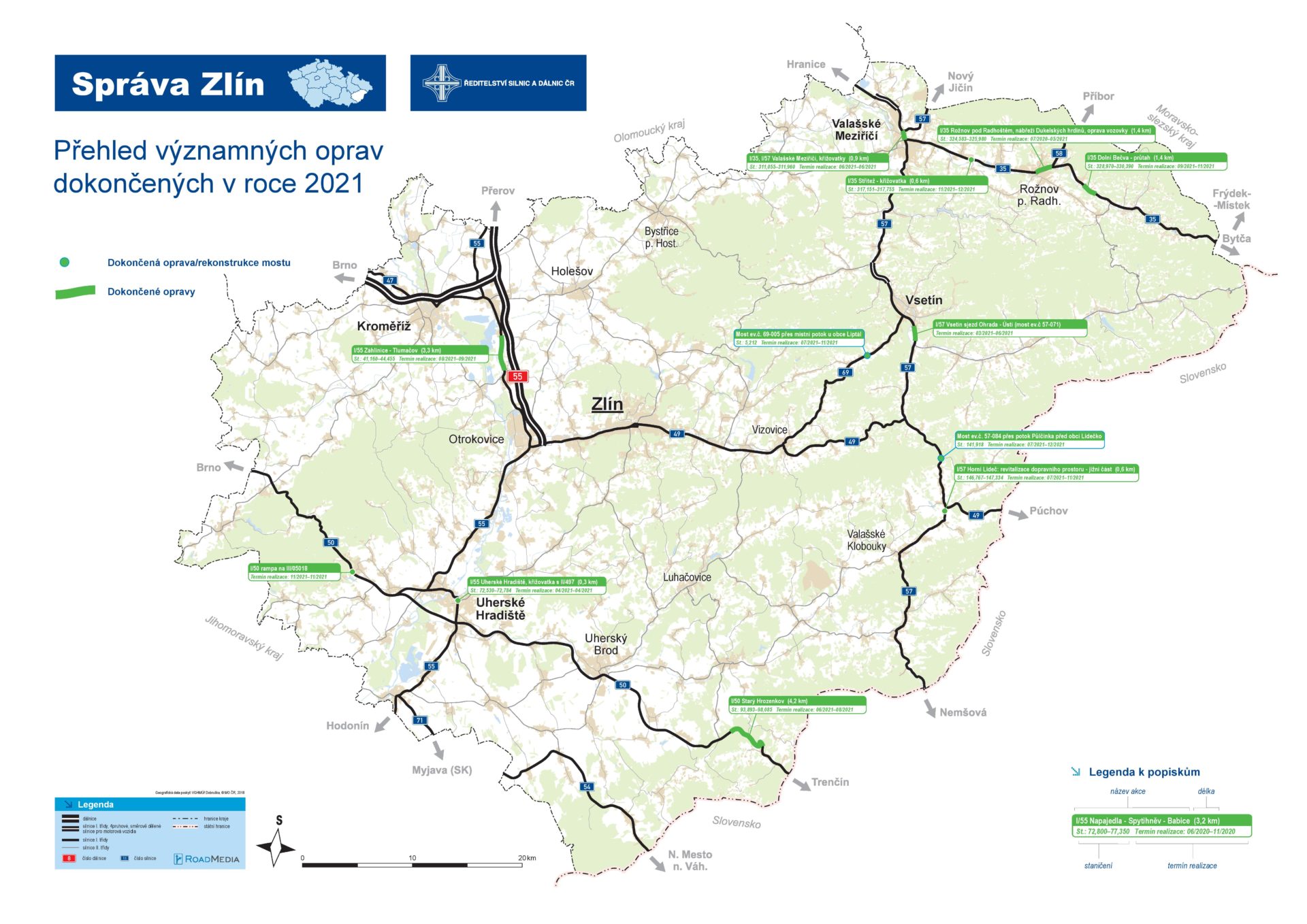 „Ve Zlínském kraji jsme opravili téměř 15 km silnic I. tříd a 2 mosty. Celkem šlo o 13 projektů oprav. Také výstavba nových dálničních úseků letos významně pokročila. Skvělou zprávou je, že jsme začátkem prosince po 13 letech nucené pauzy opět zahájili práce na stavbě dálnice D49 Hulín – Fryšták, kde aktuálně probíhá skrývka ornice. Práce na dálničním tělese zahájíme hned na začátku stavební sezóny 2022,“ sdělil ředitel Správy Zlín ŘSD Karel Chudárek.