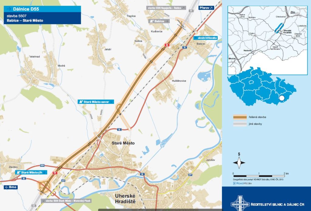 Z patřičného nadhledu si opět můžete prohlédnout nově vznikající dálnici D55 mezi Babicemi a Starým Městem. Součástí stavby je vybudování 9 mostů, 2 mimoúrovňových křižovatek a 1 protihlukové stěny. Předpoklad dokončení tohoto 8,5 km úseku je v roce 2024.