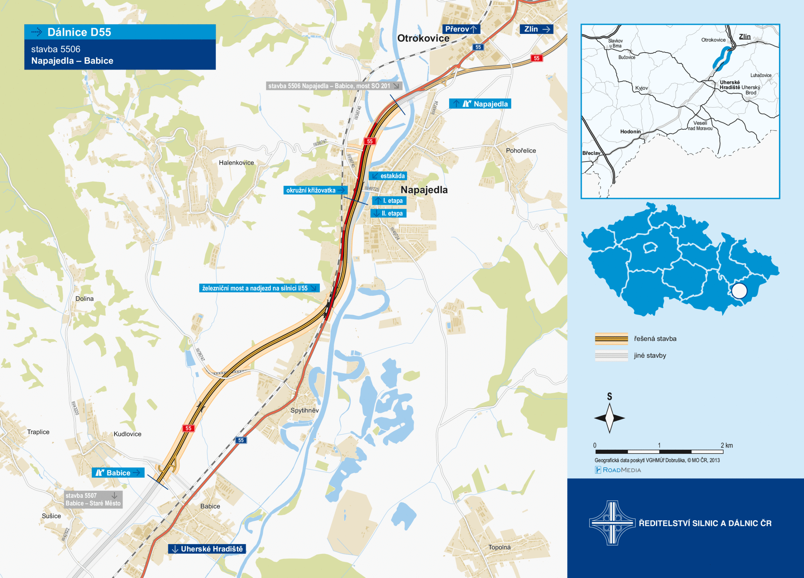 Stavba dálnice D55 Napajedla – Babice je rozdělená do 3 etap: