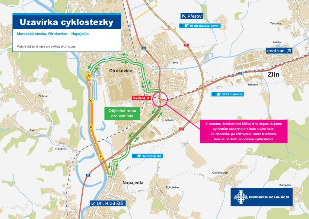 „Uvědomujeme si, že uzavřením frekventované cyklostezky, která spojuje Napajedla a Otrokovice, způsobíme cyklistům i tamním obyvatelům dočasný diskomfort. Z důvodu zajištění bezpečnosti bohužel neexistuje jiné řešení. Hledali jsme varianty, jak daný úsek ponechat průchozí. Řešili jsme například vybudování speciálního tubusu či převedení stezky na druhý břeh. Vzhledem k tomu, že stavební práce realizujeme po obou stranách řeky Moravy a pohybuje se zde těžká technika, není možné do těchto prostor pustit veřejnost. Snažili jsme se najít adekvátní objízdnou trasu. Ta povede z Napajedel ulicí Dr. Beneše přes nový nadjezd nad dálnicí D55 a okružní křižovatku na silnici I/55, dále přes kvítkovickou křižovatku k nákupnímu centru Kaufland. Zde se cyklisté napojí na stávající cyklostezku,“ vysvětlil ředitel Správy Zlín ŘSD Karel Chudárek.