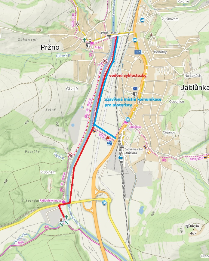 Stavba přeložky silnice „I/57 Semetín – Bystřička“ si vyžádá úplnou uzavírku místní komunikace, takzvané objížďky Jablůnky od začátku července. Vyloučení motoristů z provozu naopak vystřídá dočasné převedení cyklistické trasy č. 50 z cyklostezky Bečva na tuto komunikaci z důvodu postupujících prací a související uzavírky cyklotrasy u obce Pržno. Upozorňujeme cyklisty a tamní obyvatele na zvýšený provoz nákladních vozidel navážejících stavební materiál.