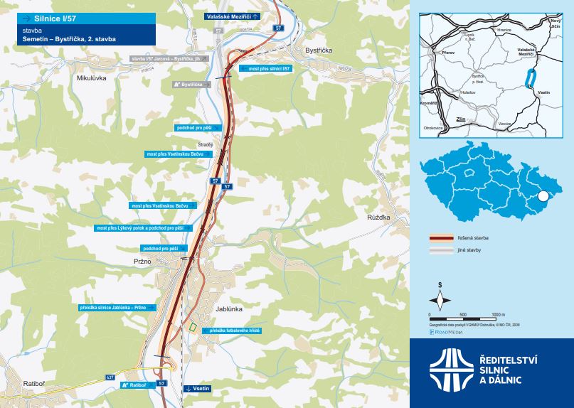 Při akci I/57 Semetín – Bystřička, 2. stavba vzniká podél Vsetínské Bečvy další velký úsek čtyřpruhové silnice. Práce na 4,4 kilometru dlouhé stavbě vyjdou na 1,7 miliardy Kč bez DPH. Trasa navazuje na vedlejší, 2,6 kilometru dlouhou stavbu, která je v provozu od roku 2009. Nový úsek je pokračováním přeložky silnice I/57 mimo zastavěné území, navazuje na dokončenou stavbu I/57 Semetín – Bystřička, 1. stavba. Budoucí přeložka řeší jednu z etap výstavby silnice R57 Valašské Meziříčí – Vsetín v části Bystřička – Jablůnka. Jde o spojení největších měst v regionu; ve Vsetíně a Valašském Meziříčí žije téměř 50 000 lidí a projede tam denně kolem 13 000 aut.