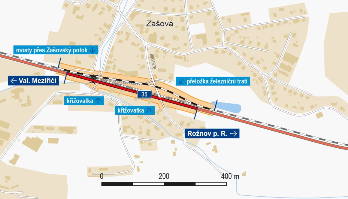 Nová křižovatka bude řízená světelnou signalizací. Přibydou odbočovací pruhy, nové chodníky a hlavně bude odsunuta železniční trať dále od silnice I/35. V rámci stavby bude také rekonstruována železniční zastávka Zašová.