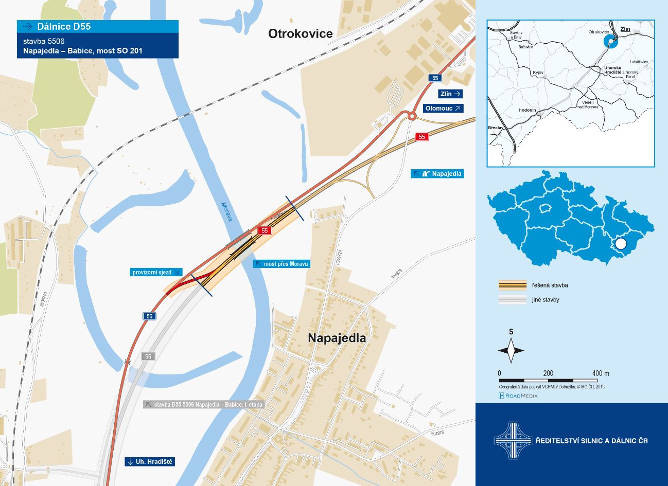 Stavba D55 5506 Napajedla – Babice je rozdělena do dvou etap. Stavba mostu přes řeku Moravu, která navazuje na obchvat Otrokovic, je první etapou. Po jejím dokončení navážeme další etapou dálnice D55 mezi Napajedly a Babicemi.