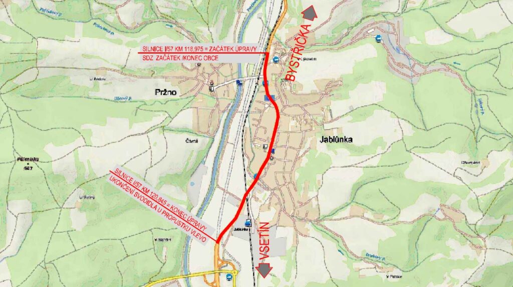 Další silnice I. třídy na Valašsku, do jejíž opravy se pustíme v září, je úsek komunikace I/57 v obci Jablůnka. Realizaci přípravných prací na krajnicích a příkopech plánujeme od 4. 9. do 10. 9. Oprava povrchu vozovky proběhne v termínu od 11. 9. do 30. 11. Provoz bude veden kyvadlově a řízen semafory či regulovčíky.