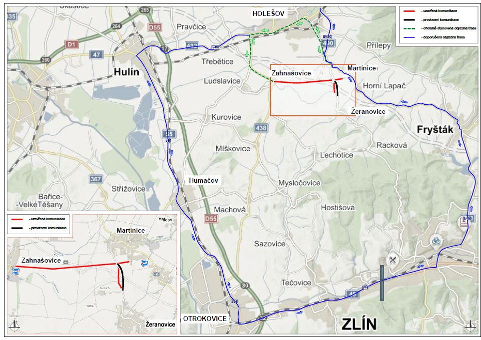 Vzhledem k posunu prací na stavbě dálnice D49 v úseku Hulín – Fryšták bude nutné částečně uzavřít křižovatku u Zahnašovic u Holešova. Omezení začne platit v úterý 8. 11. Zcela neprůjezdná bude obslužná komunikace mezi Zahnašovicemi a Martinicemi (silnice Šindelná) minimálně do konce roku 2023. Zachován zůstane provoz mezi Žeranovicemi a Martinicemi. Objízdná trasa povede pro všechna vozidla přes město Holešov, než bude vyřešena náhradní objízdná trasa pro vozidla nad 7,5t přes průmyslovou zónu Holešova.
