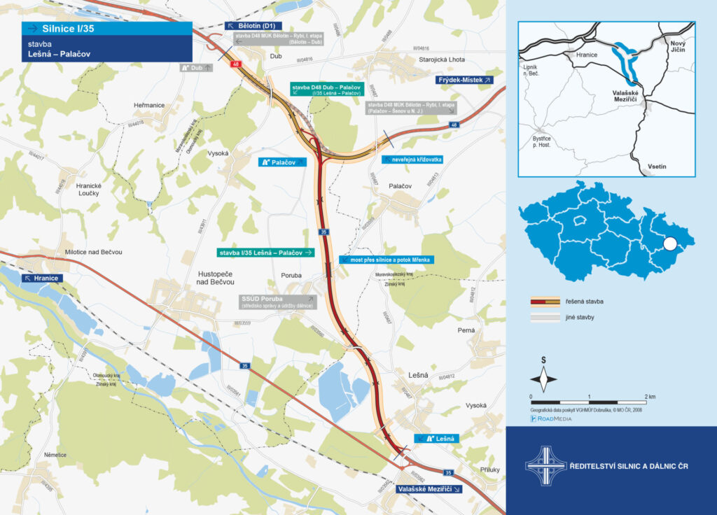Ředitelství silnic a dálnic dnes zahajuje výstavbu akce I/35 Lešná – Palačov. Jedná se o novostavbu čtyřpruhové silnice I/35 mezi obcemi Lešná a Palačov a přestavbu silnice I/48 mezi Dubem a Palačovem na dálnici D48. Obě komunikace budou vzájemně propojeny novou mimoúrovňovou křižovatkou. Stavba má nadregionální význam a propojí Zlínský, Olomoucký a Moravskoslezský kraj.